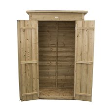 Traditional pressure treated overlap construction is used on the back and side panels which are complemented by a smooth-planed shiplap tongue & groove front panel and doors. The felted pent roof keeps the store weathertight and can be assembled sloping backwards or forwards to suit personal preference and position. It is attractively finished with smooth planed barge boards which also protect the edges of the felt from being damaged. The base is mounted on Pressure Treated bearers to keep it off the ground and dry so that it is not damaged by moisture.