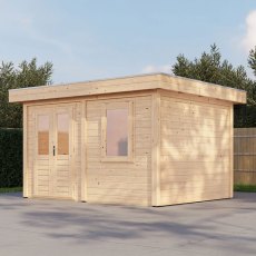 The Lugarde Select Modern Summerhouse 28mm and 44mm Cardiff 388x300cm combines contemporary design with robust construction. This high-quality log cabin has a sleek flat wall profile, double-glazed laminated wood doors, and an additional opening window. Finished in a rich brown wood oil, it offers both style and durability. Top features include: