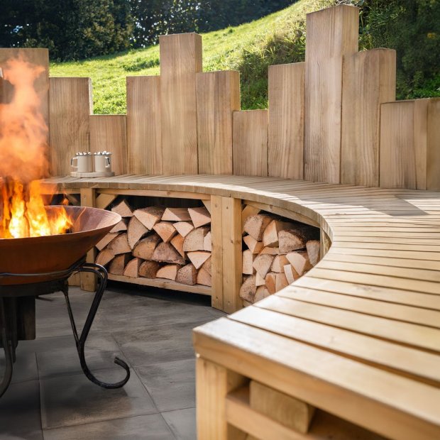 Underneath, there's built-in space for neatly stacking logs, enhancing the rustic look while keeping fuel close at hand. And with a 15-year Anti-Rot Guarantee, these benches are made to last in all weather conditions, requiring little more than occasional cleaning.