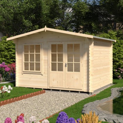 - Classic, log cabin appearance with an attractive apex roof and elegant, Georgian-style window